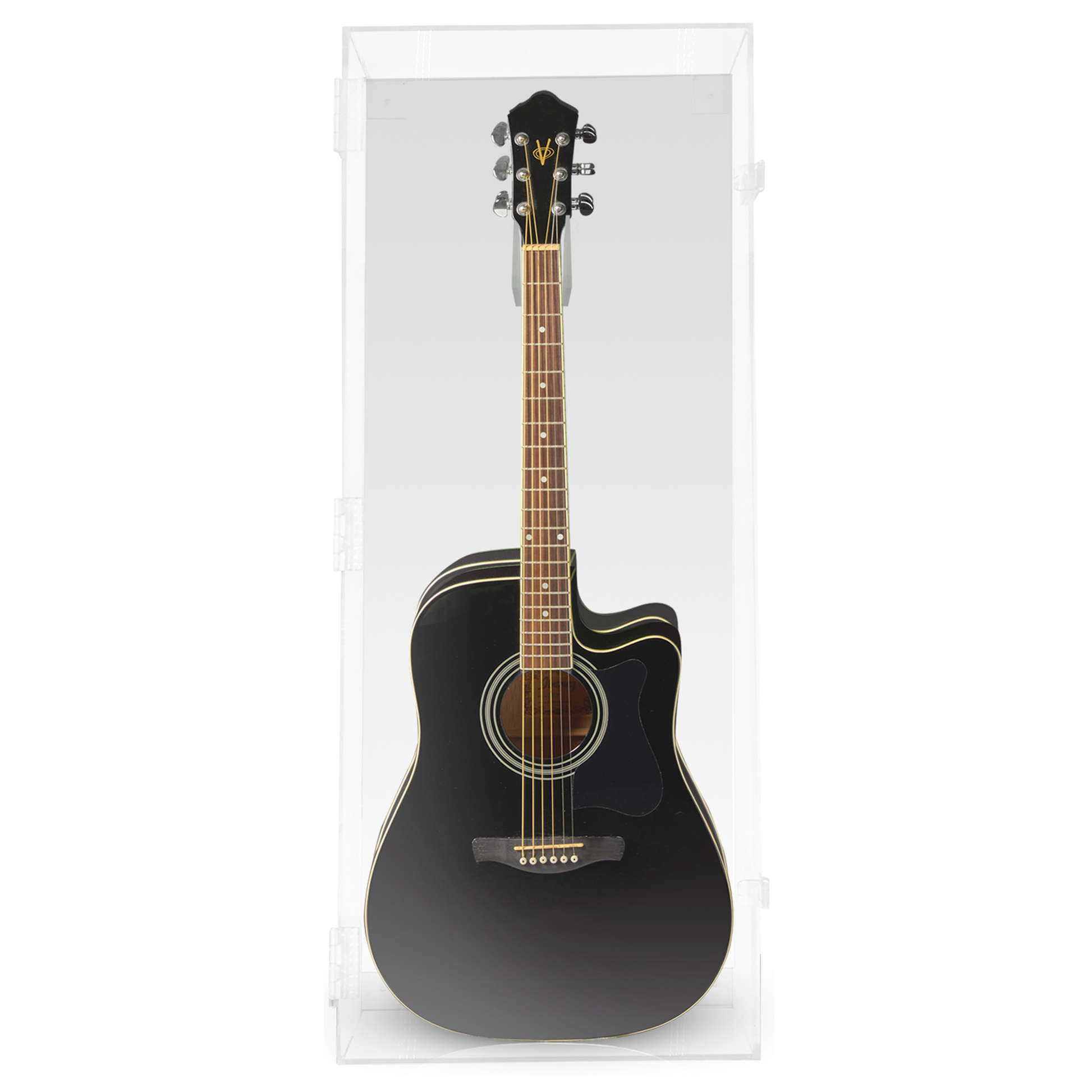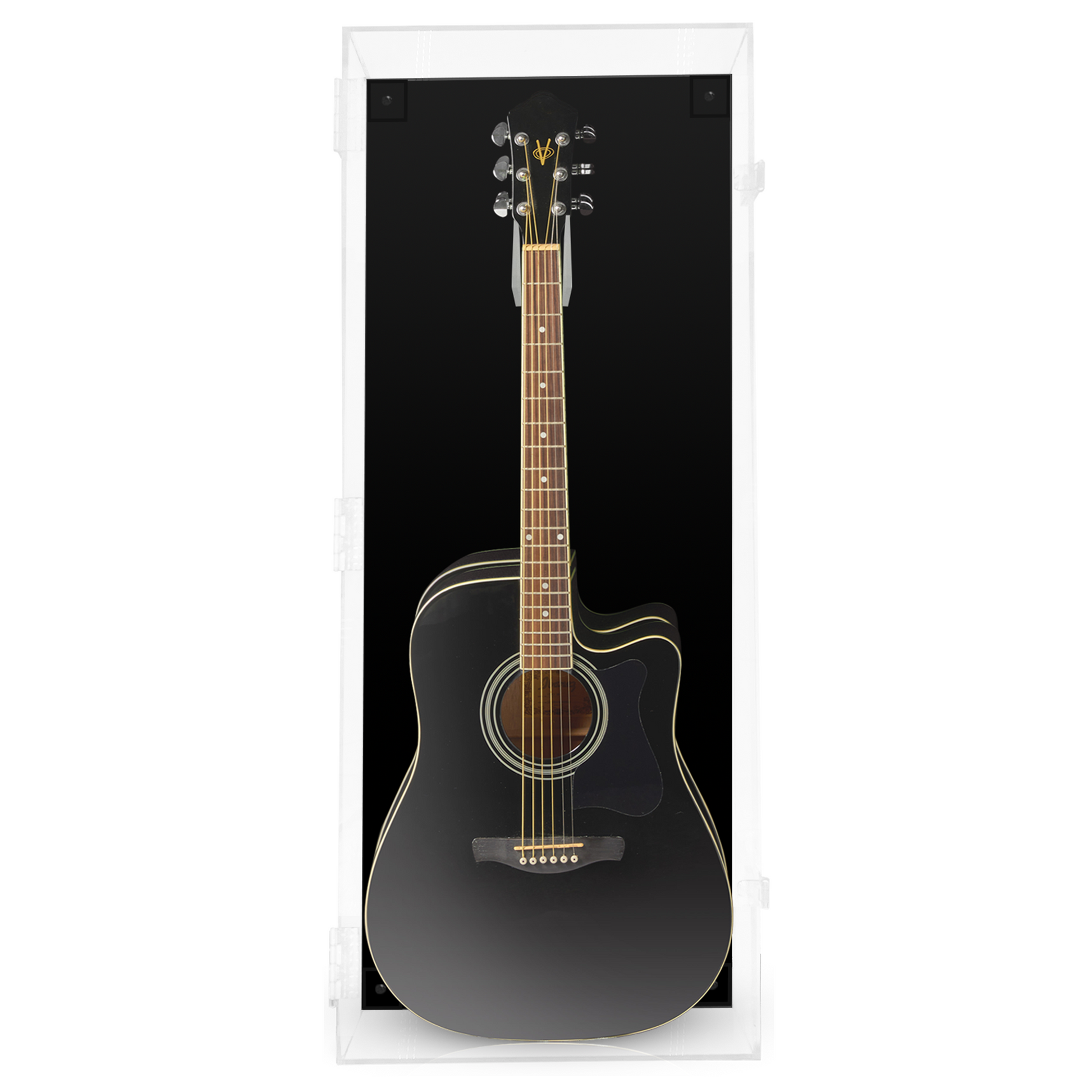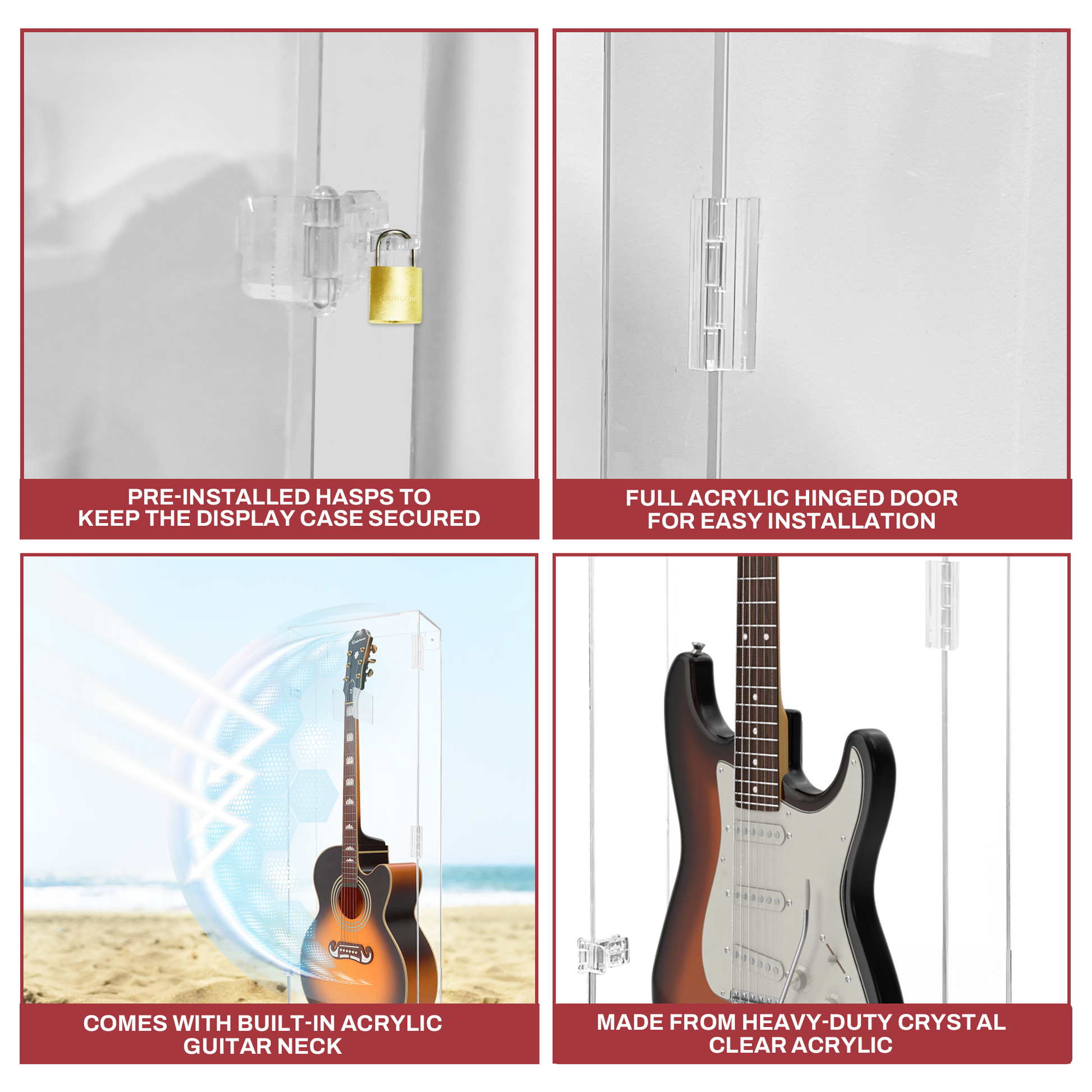 - 【Proudly Made in USA, Premium Fully Acrylic Guitar Display Case】 - Our acrylic wall mount display case is made from crystal clear acrylic that highlights the beauty of your guitar. Our acoustic acrylic guitar case has outside dimensions of 44" x 17" x 5.5" and inside dimensions of 43.5' x 16.5 x 5' that can fit your electric and acoustic guitars. Comes with pad lock to keep your valuable electric acoustic guitar collectible display safe!