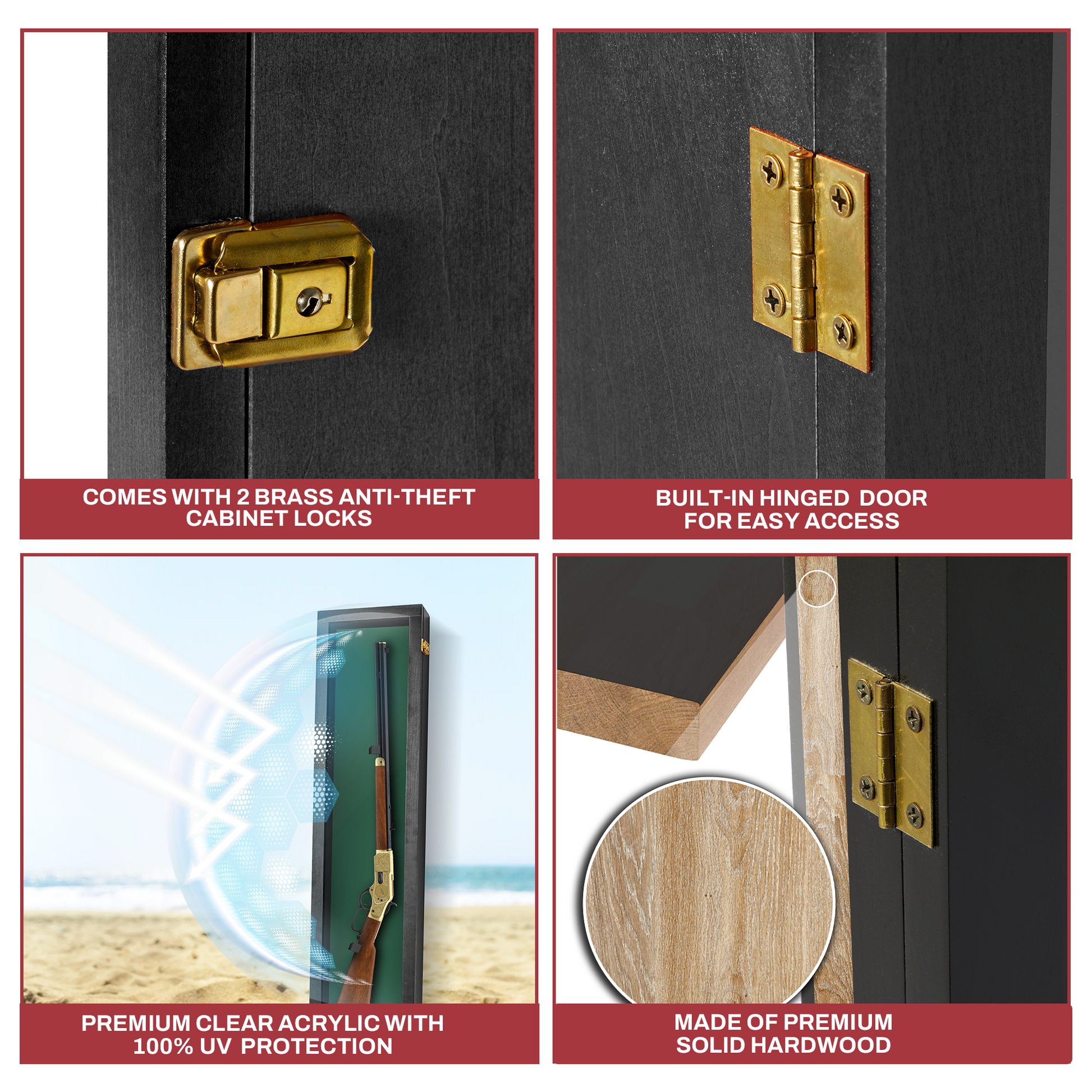 【 Display & Keep Your Gun Safe 】- Our gun display wall mount features a hinged acrylic door that provides ultra-clear viewing with 100% UV protection to keep your gun or rifle from sun damage & dust free. This acrylic display box has golden locks with keys for added security.