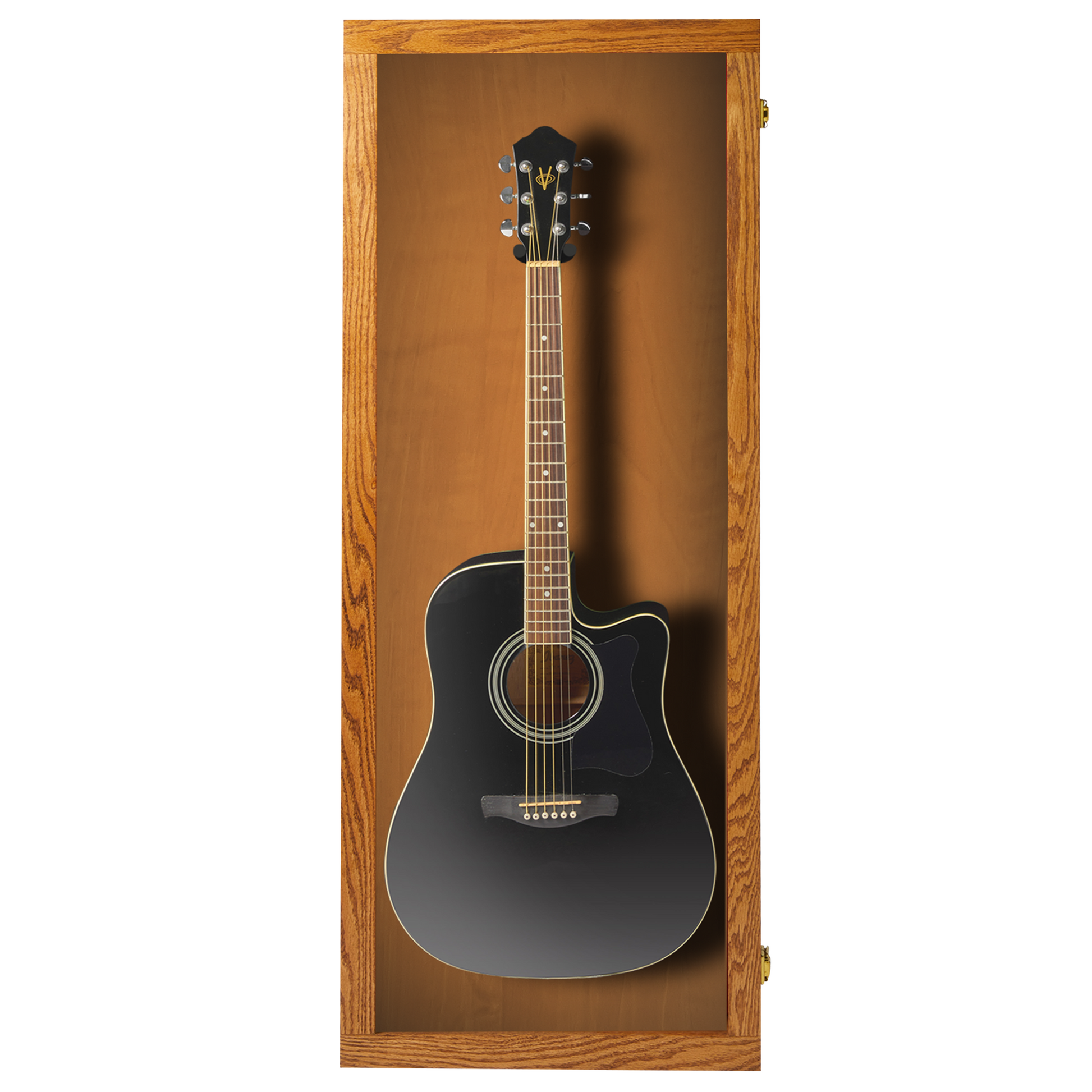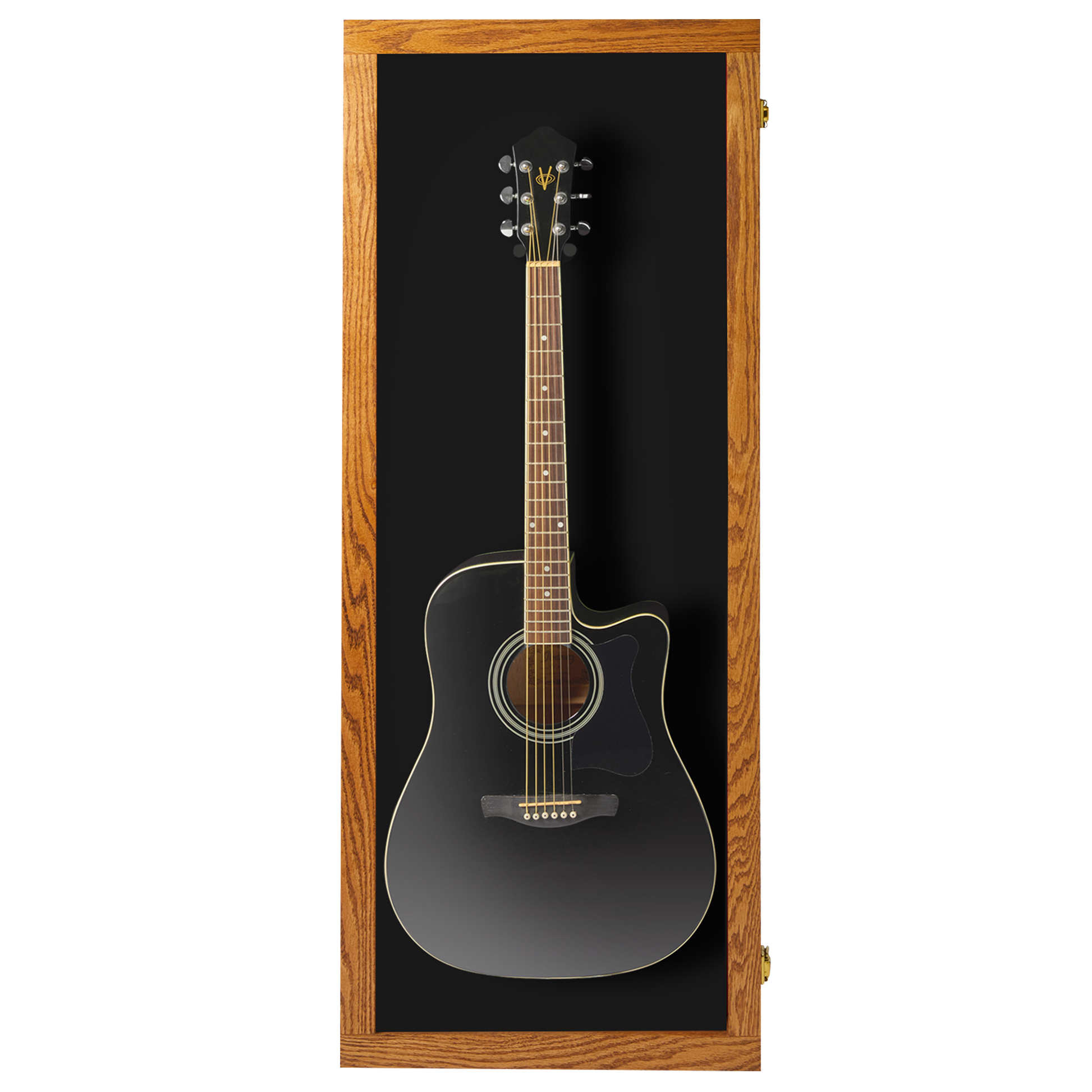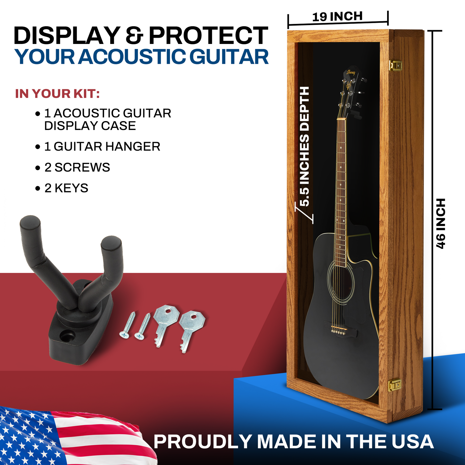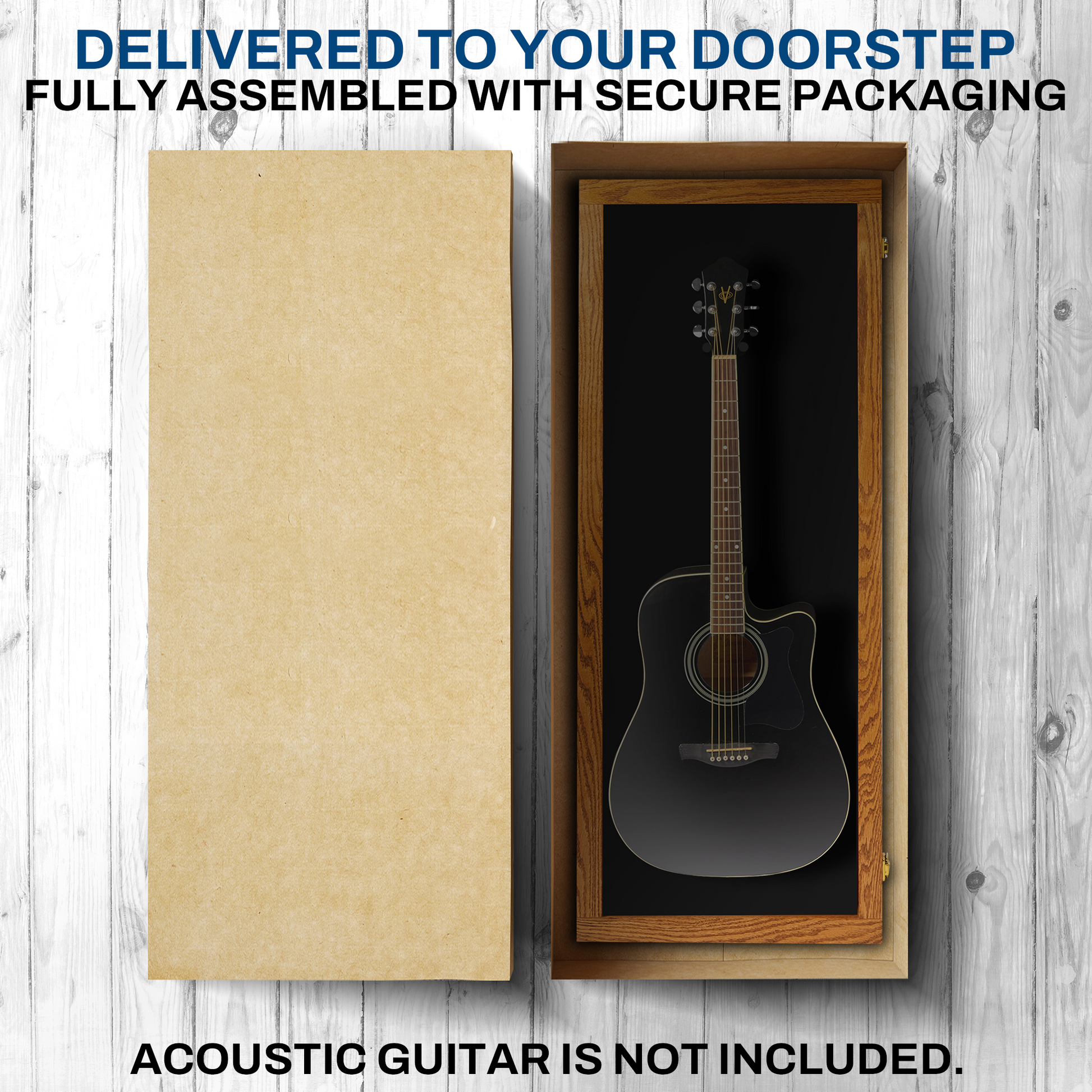 - 【Guaranteed to Withstand Deterioration】- Our guitar display cases can be both an electric guitar case or acoustic guitar case depending on the size of your guitar. This guitar display mount is built to last. On top of its hardwood glossy natural oak finish frame, our guitar wall case comes with a heavy-duty crystal clear acrylic door that provides ultra-clear viewing with 100% UV protection.
