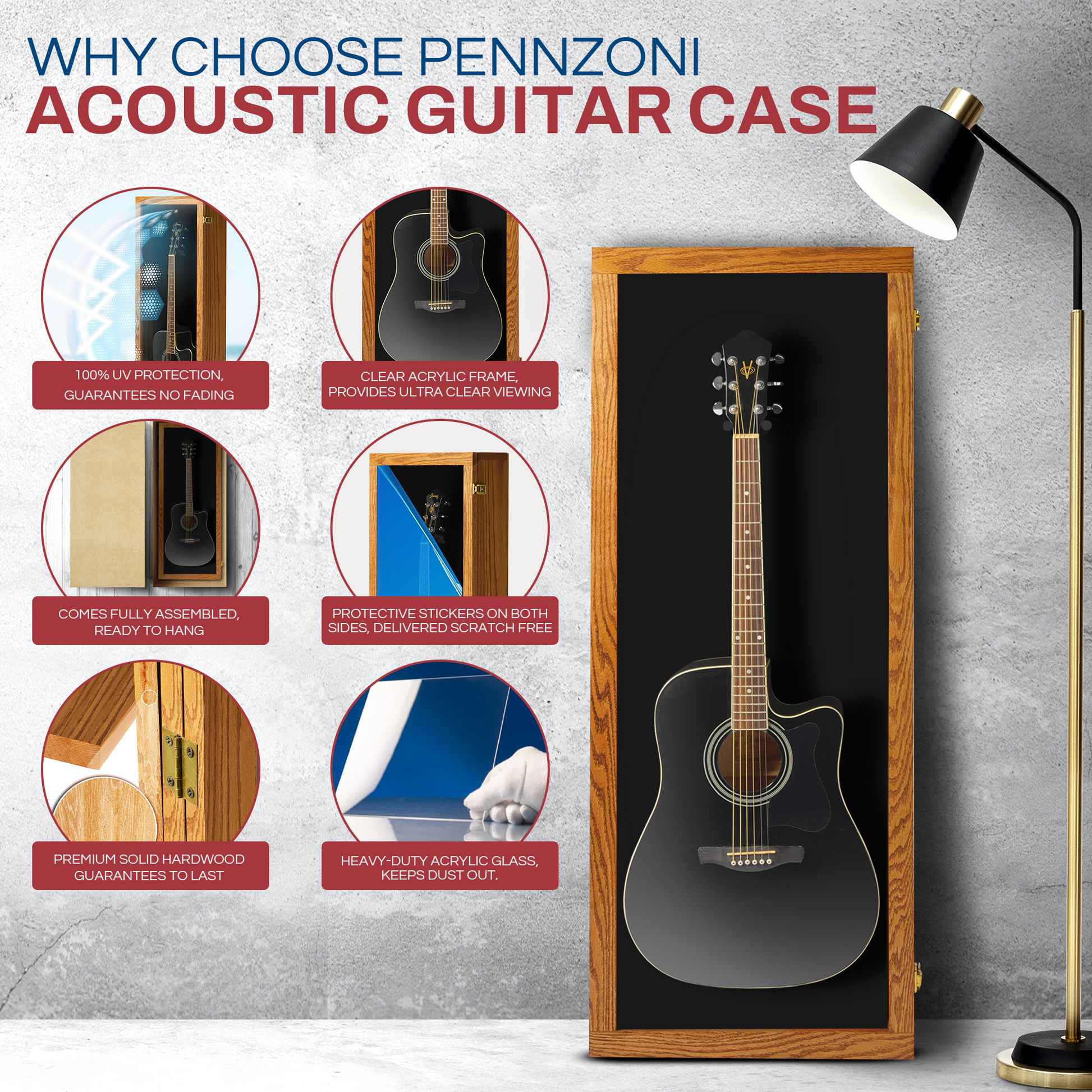 - 【Proudly Made in USA, Premium Acrylic Guitar Display Case】 - Pennzoni’s acoustic guitar wall mount is made from real hardwood with a natural oak finish that is guaranteed to last. It comes with a black velvet felt inside that highlights the beauty of your acoustic guitar. Our wood acoustic guitar case has outside dimensions of 46" x 19" x 6.5" and inside dimensions of 44" x 17" x 5.5" that can fit your acoustic and electric guitars.