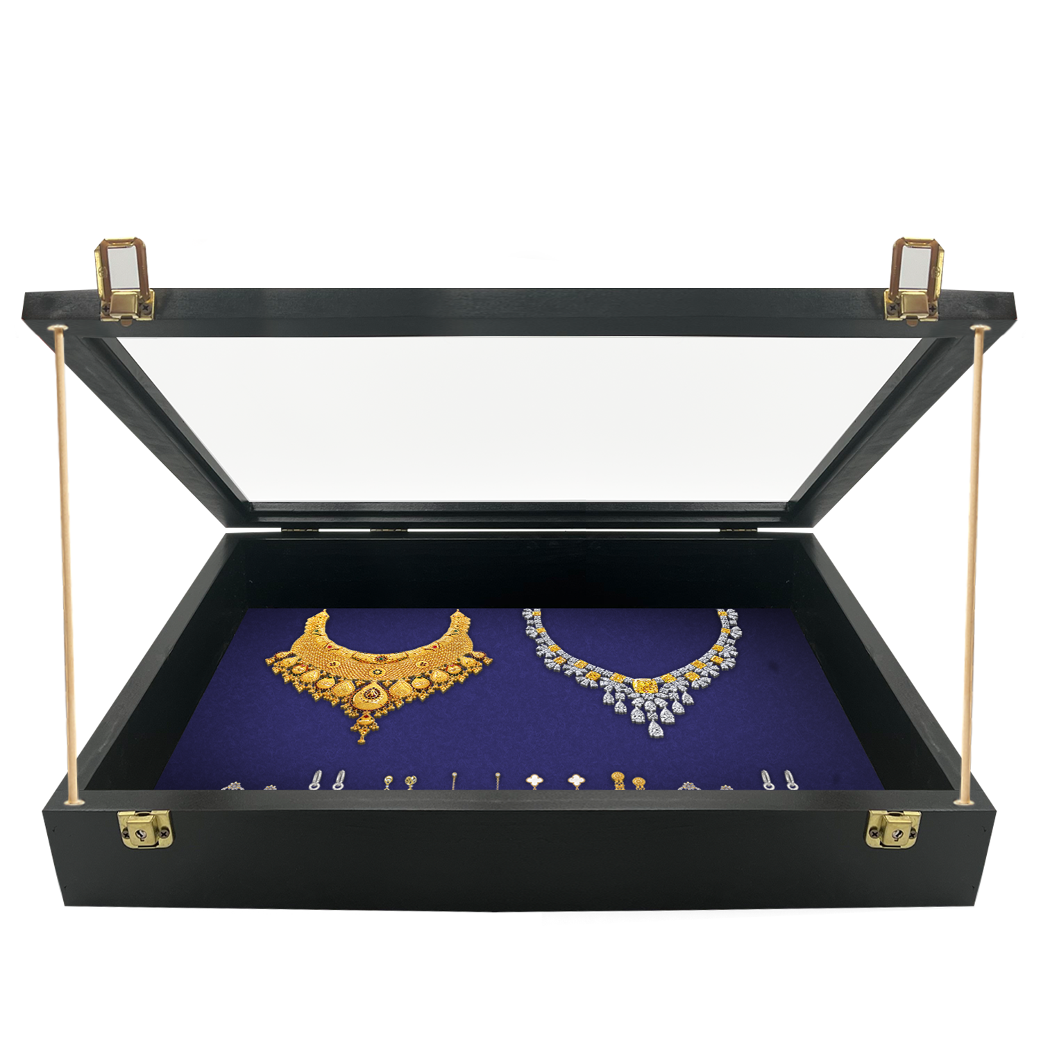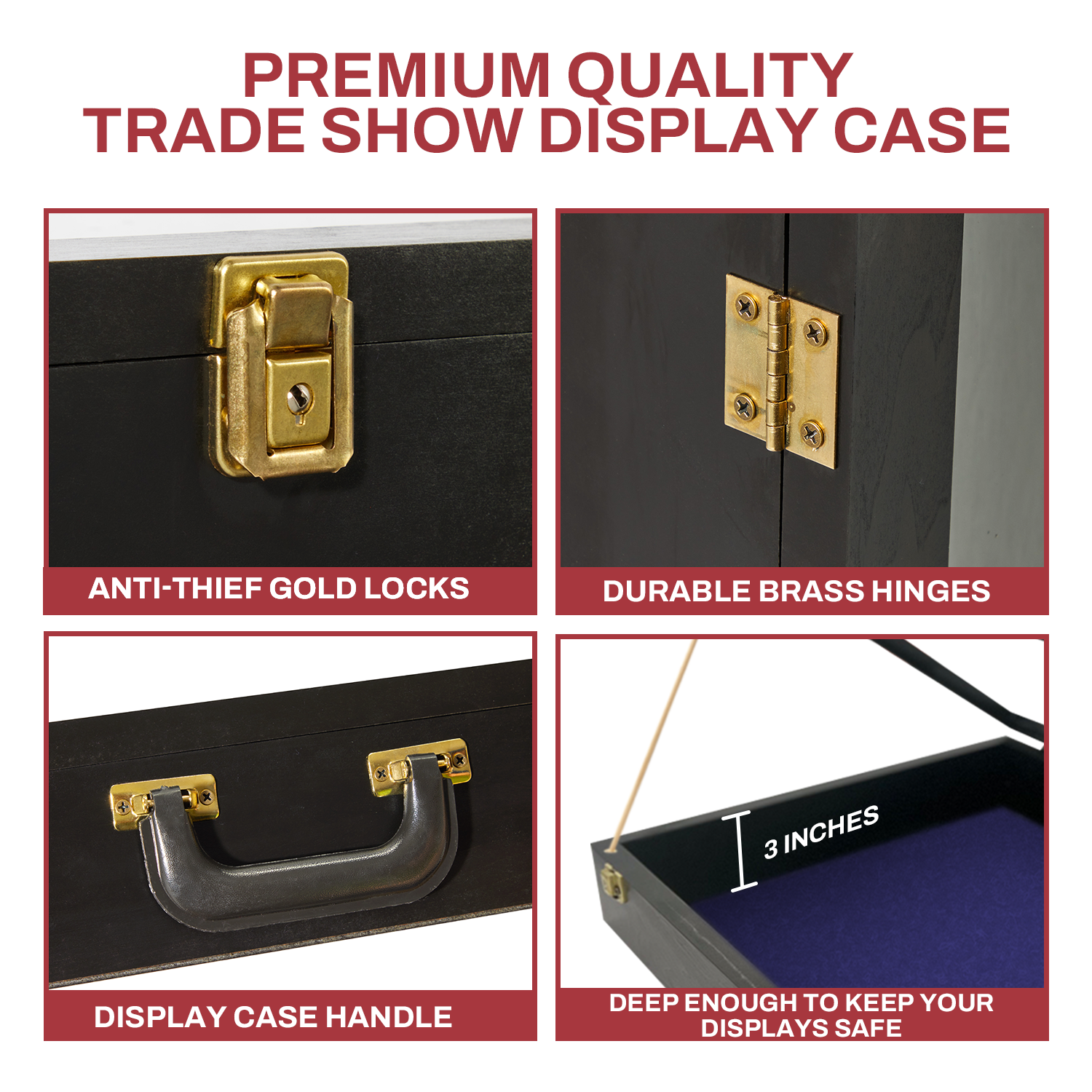 - 【Premium Trade Show Display Case】 - Proudly made in the USA. This card display case is handcrafted from high-quality hardwood w/ black, red, green, blue, and white felt, black, cherry, walnut, and golden oak finish w/ wood dowels. It has outside dimensions of 18 x 22 x 4 & inside dimensions of 16" W x 20" L and 3 depth. “ Our trade show display case has gold-plated anti-theft locks & deep enough to keep your displays safe. It includes a handle (requires installation), locks, & keys, & black, red, green, blue, and white, velvet-like felt.
