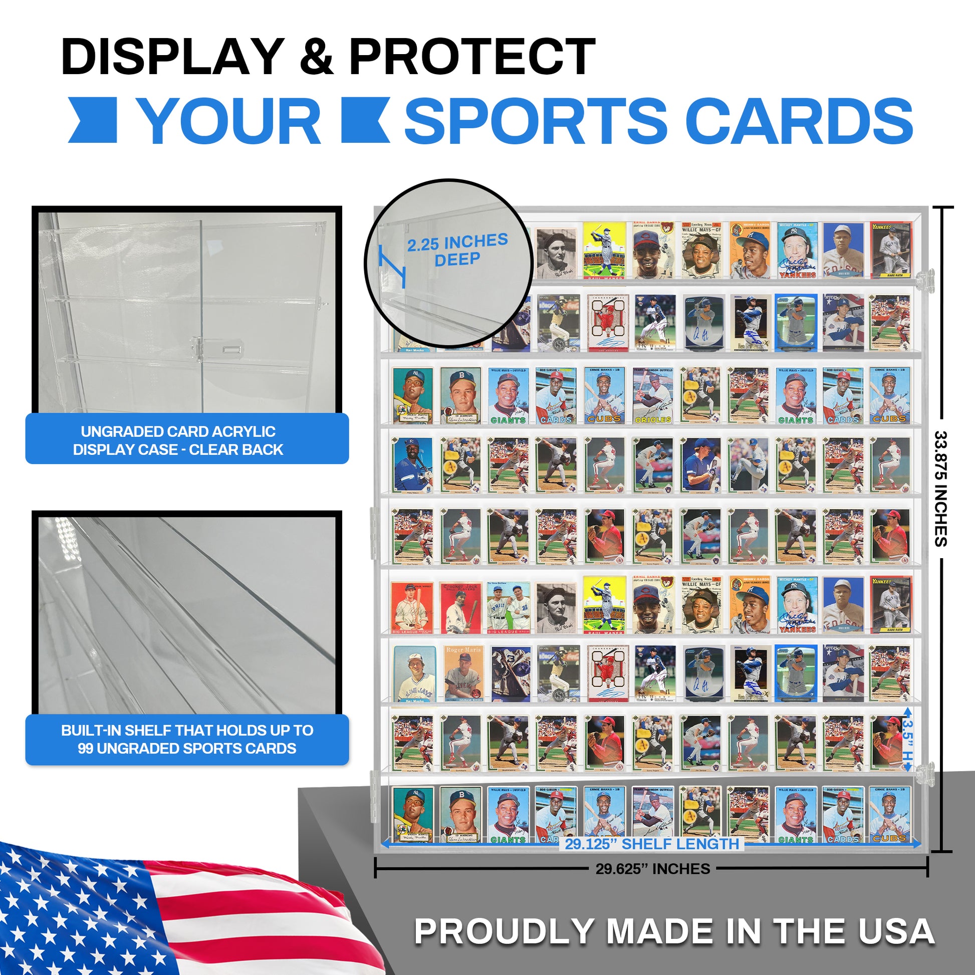Sports Card Display Case: Our portable card display is made from heavy-duty acrylic with a clear back & holds 99 ungraded sports cards. The USA-made trading card case comes w/ 2 acrylic latches. The ideal card height is 3.5".