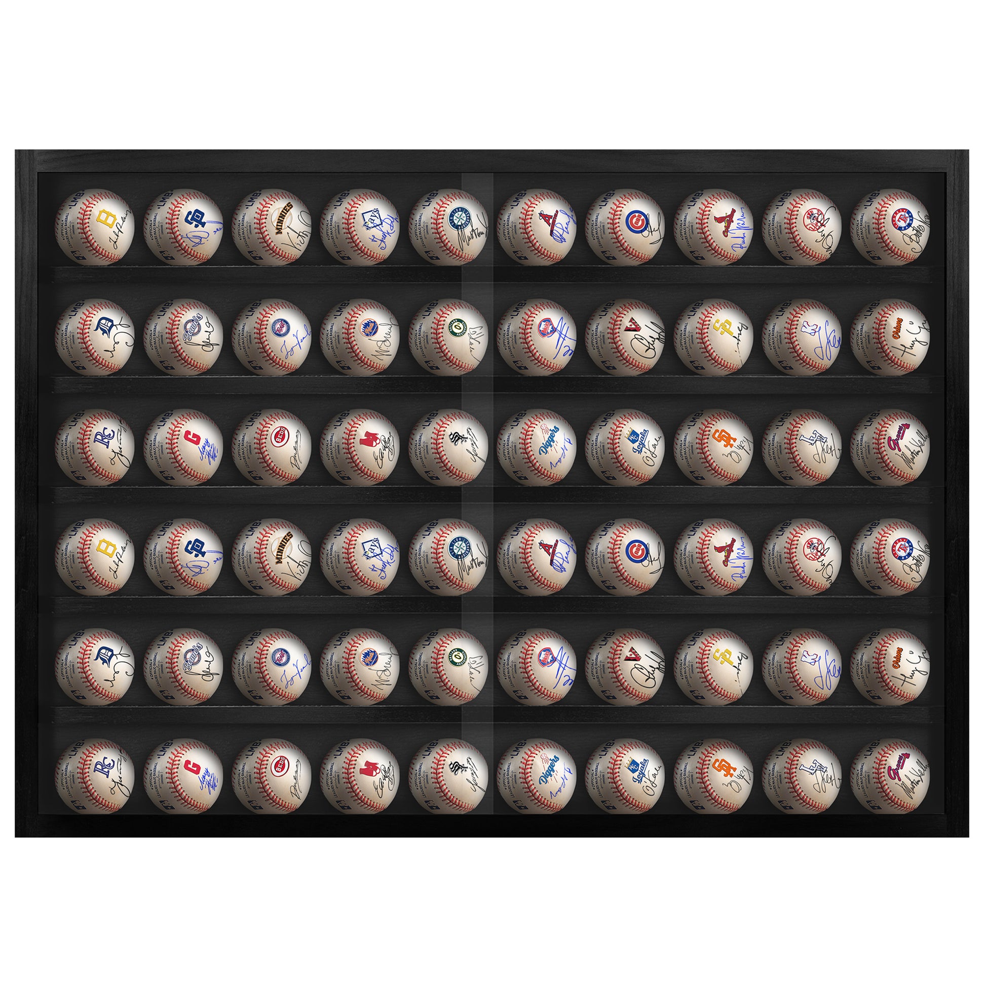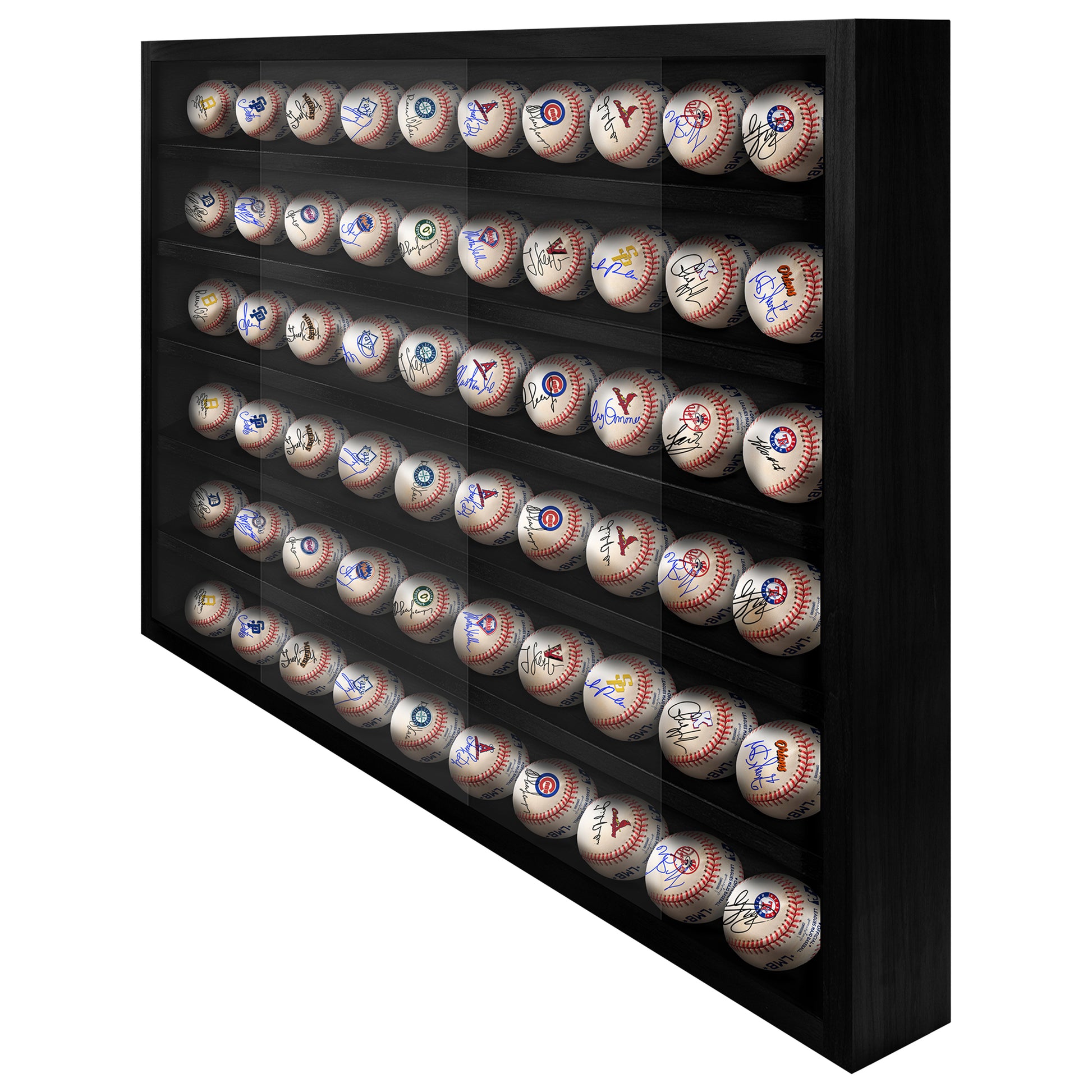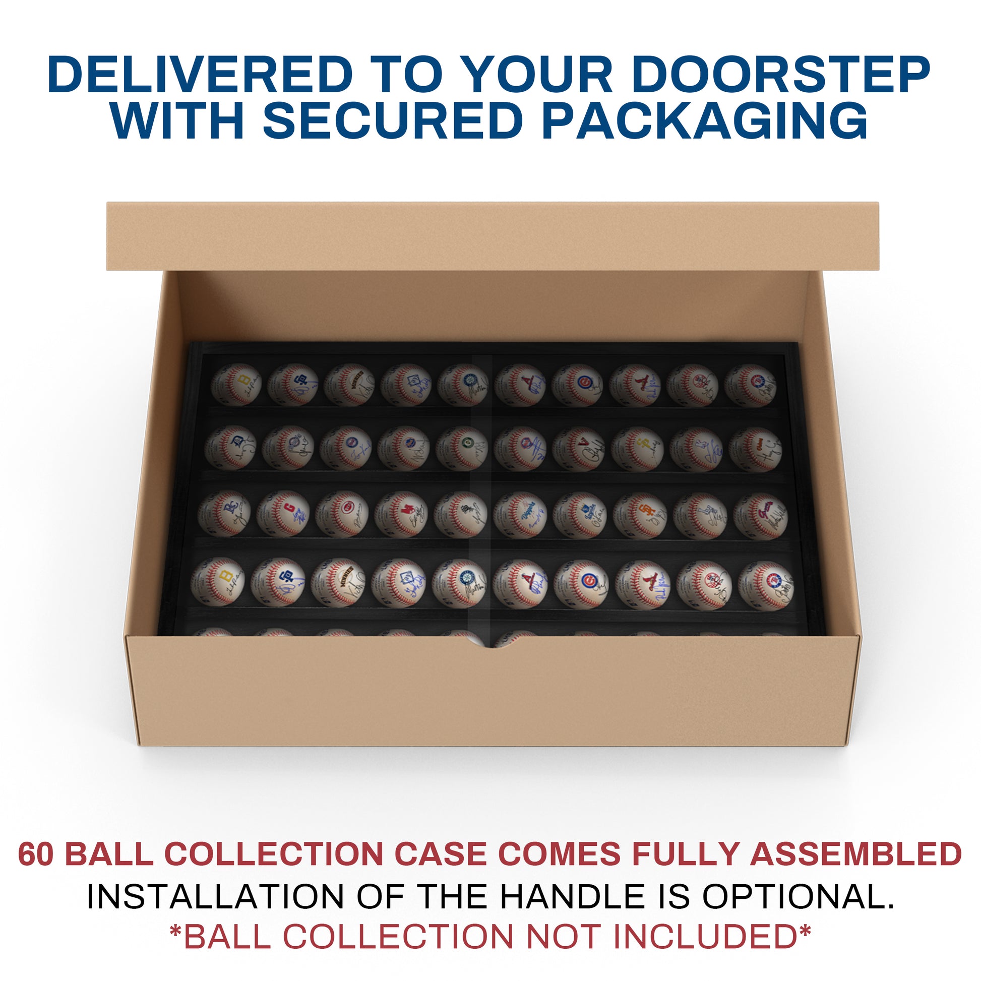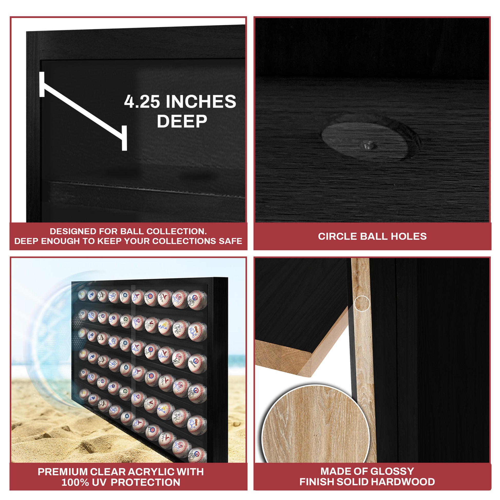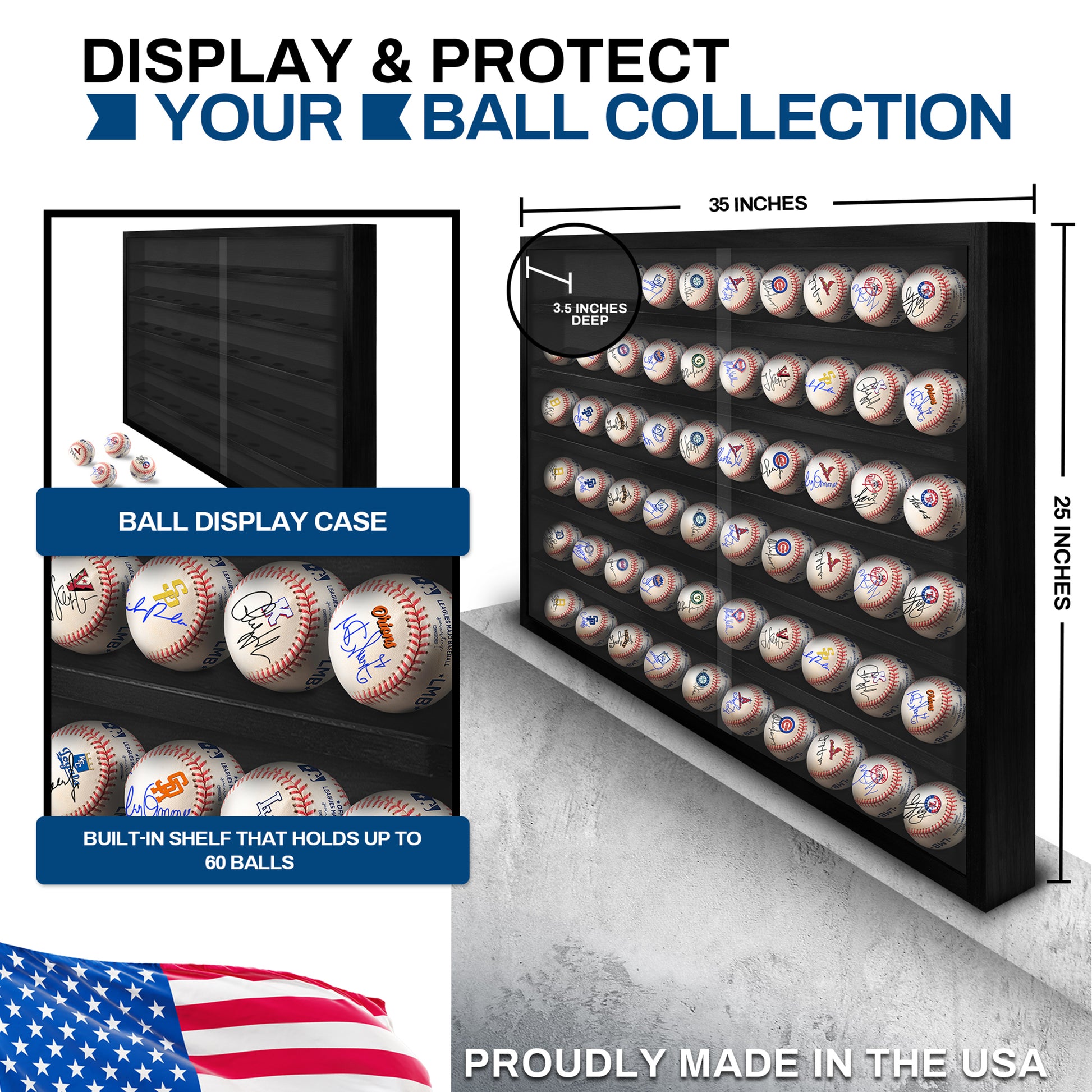 - 【Proudly Made in the USA, Premium Baseball Display Holder 】- Our baseball holders for 60-ball display with lockable anti-fade UV protection are hand-crafted from solid oak & clear acrylic. This baseball storage is made w/ an elegant black or glossy oak finish. This baseball case can hold 60 baseballs & Hockey Pucks that are 3 1/2" or less. This baseball display frame has a dimension of 35"w x 25"h x 4.25" deep.