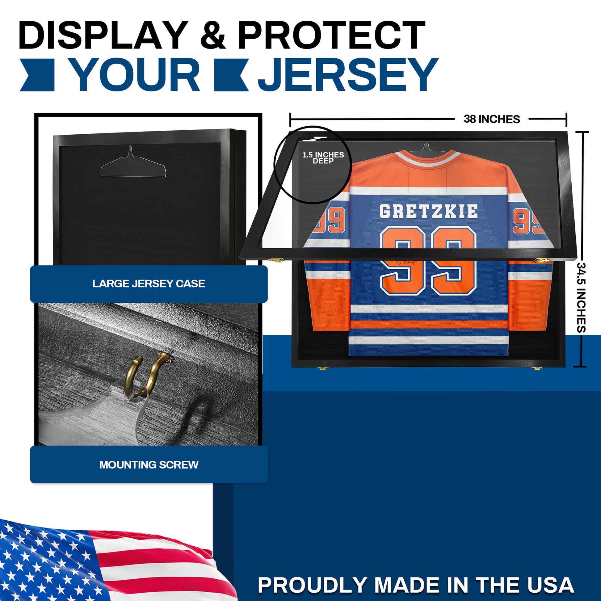 - 【Proudly Made in USA, Acrylic Display Box】- Our premium quality sports jersey display case is handcrafted from solid hardwood in a glossy black, cherry, walnut, and golden oak finish and felt option. This large acrylic display box has an acrylic hinged door w/ 100% UV protection. It has an outside dimension of 34.5"h x 38"w x 2"d, & an inside dimension of 33" x 36.5" x 1.5" deep. Included in your purchase are: (a) 2 brass hinges, (b) anti-theft gold locks w/ keys, (c ) 2 gator tooth hooks for wall mounting, & (d) a clear hanger.