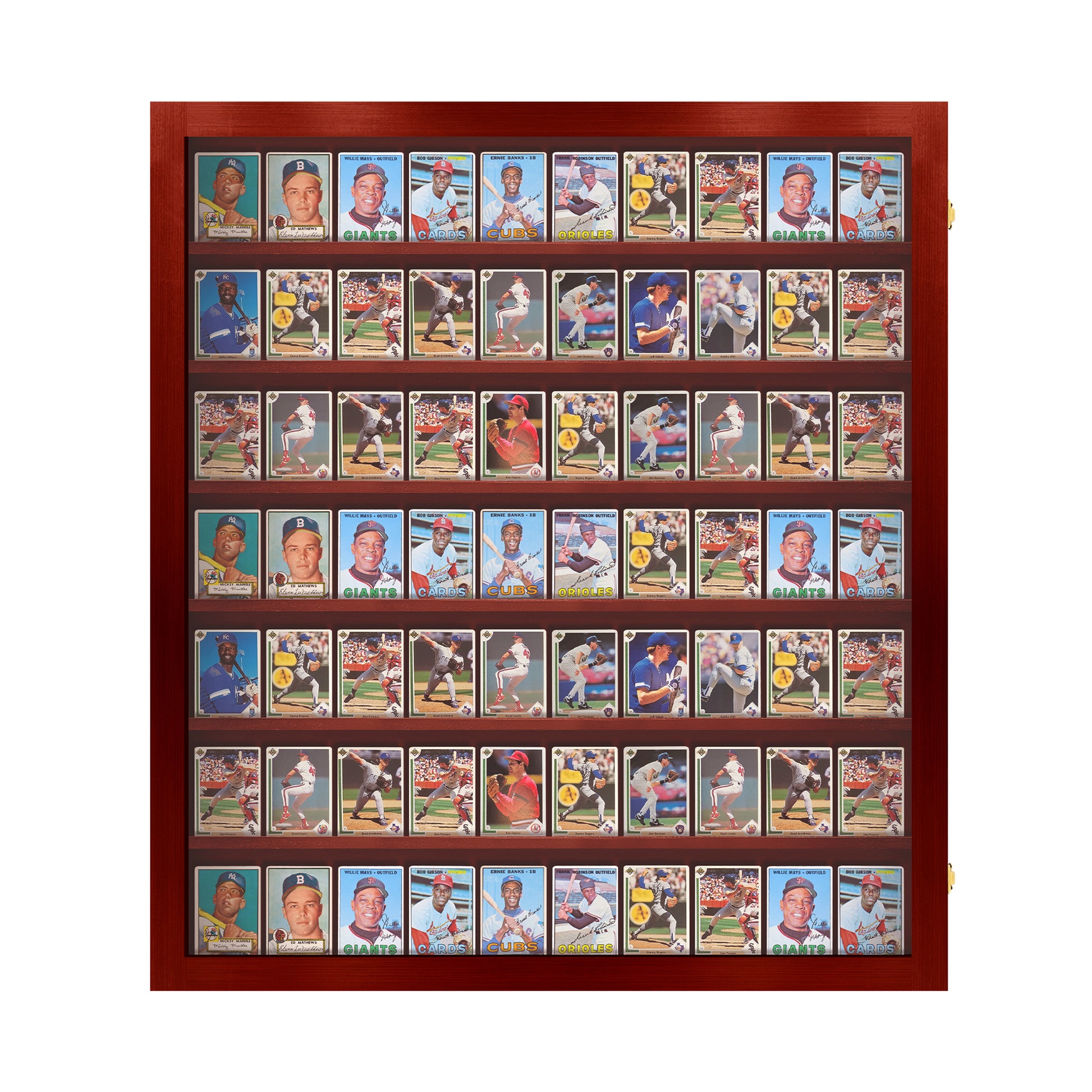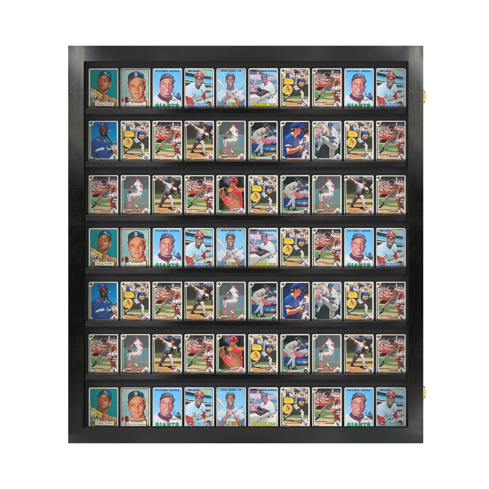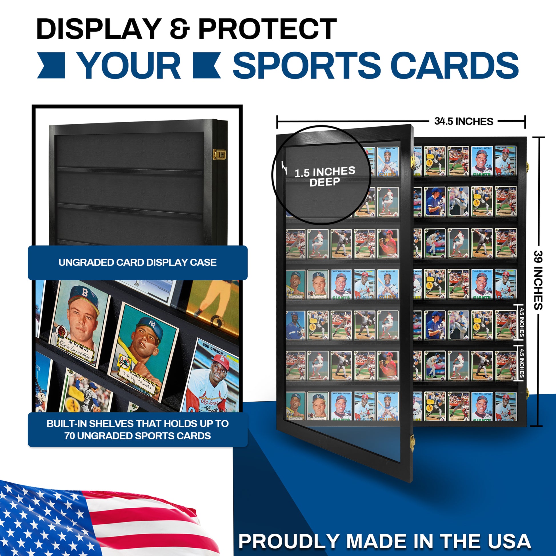 • 【Proudly Made in USA, Premium Card Display Case】- Our sports card display case is handcrafted from solid hardwood w/ a black, cherry, walnut and golden oak finish. It can hold up to 60-74 ungraded sports cards w/ an ideal height of 4.5" & 1.5” thick. It comes w/ brass hinges & 2 brass locks w/ a key. It has outside dimensions of 34.5" w - 39" h - 2" deep, while the inside dimensions measure 33" w - 36.5" h - 1.5" deep. Our ungraded card display case is deep enough to keep your sports & Pokemon cards safe.