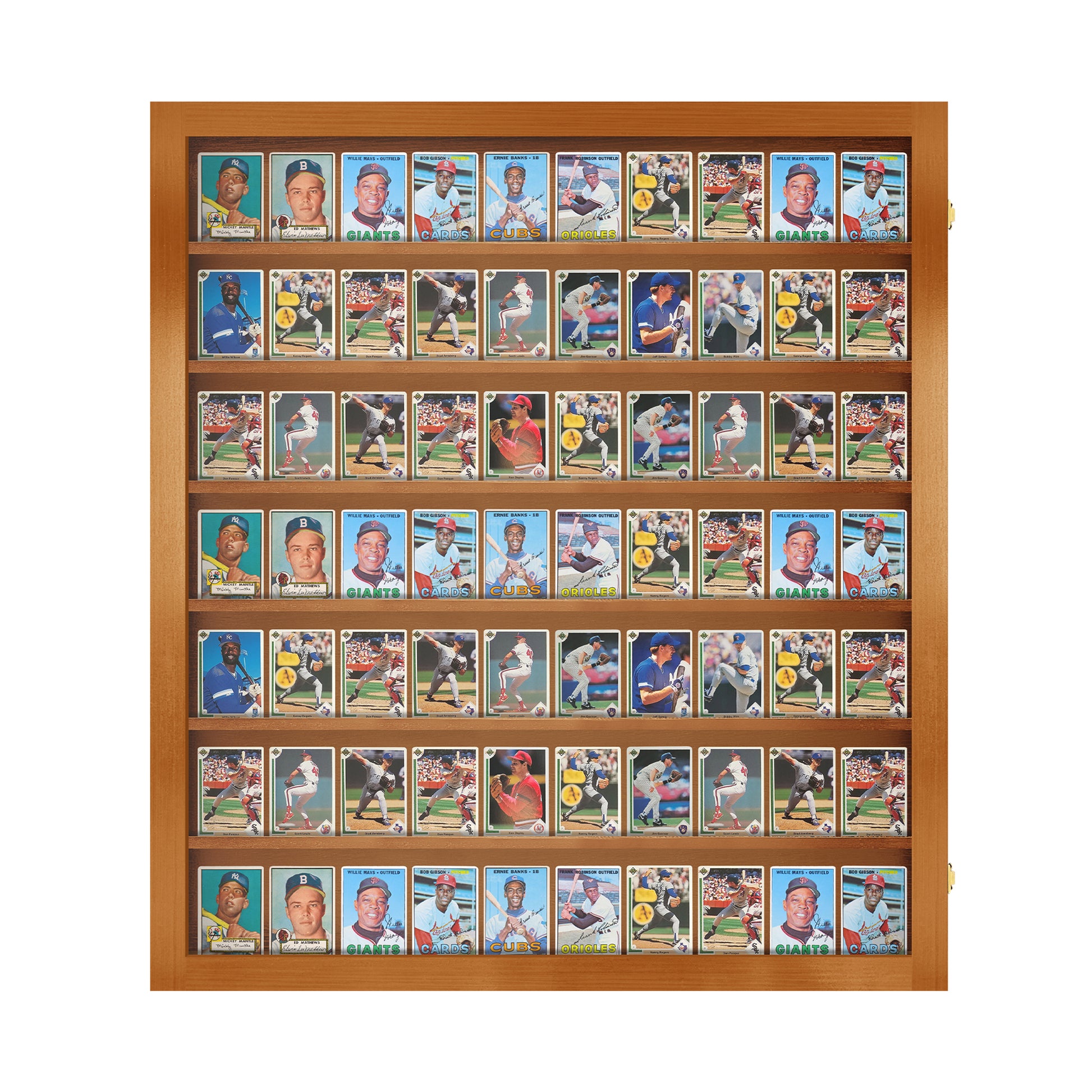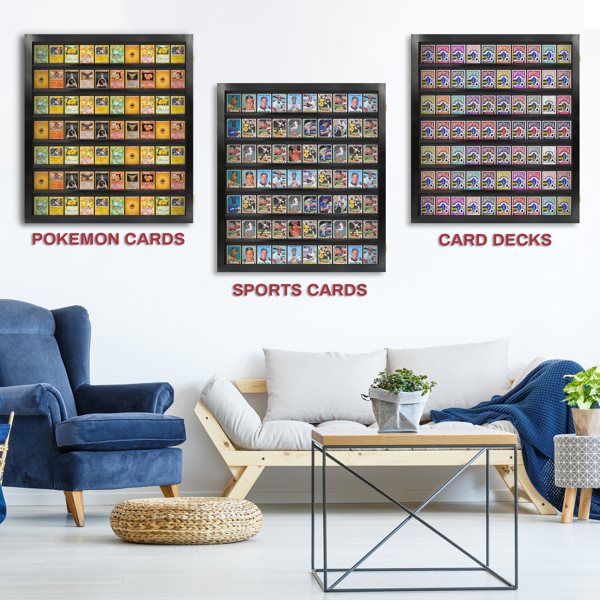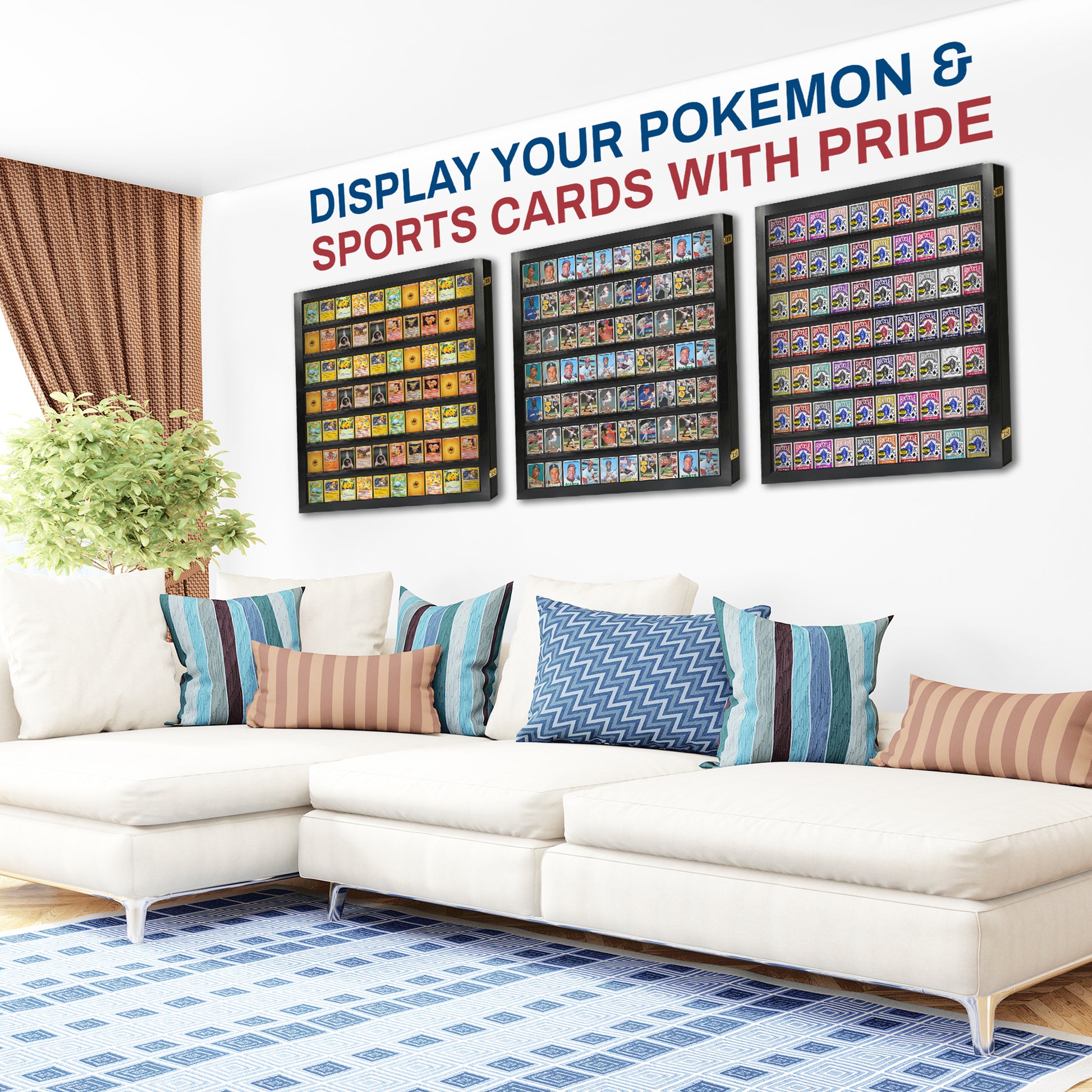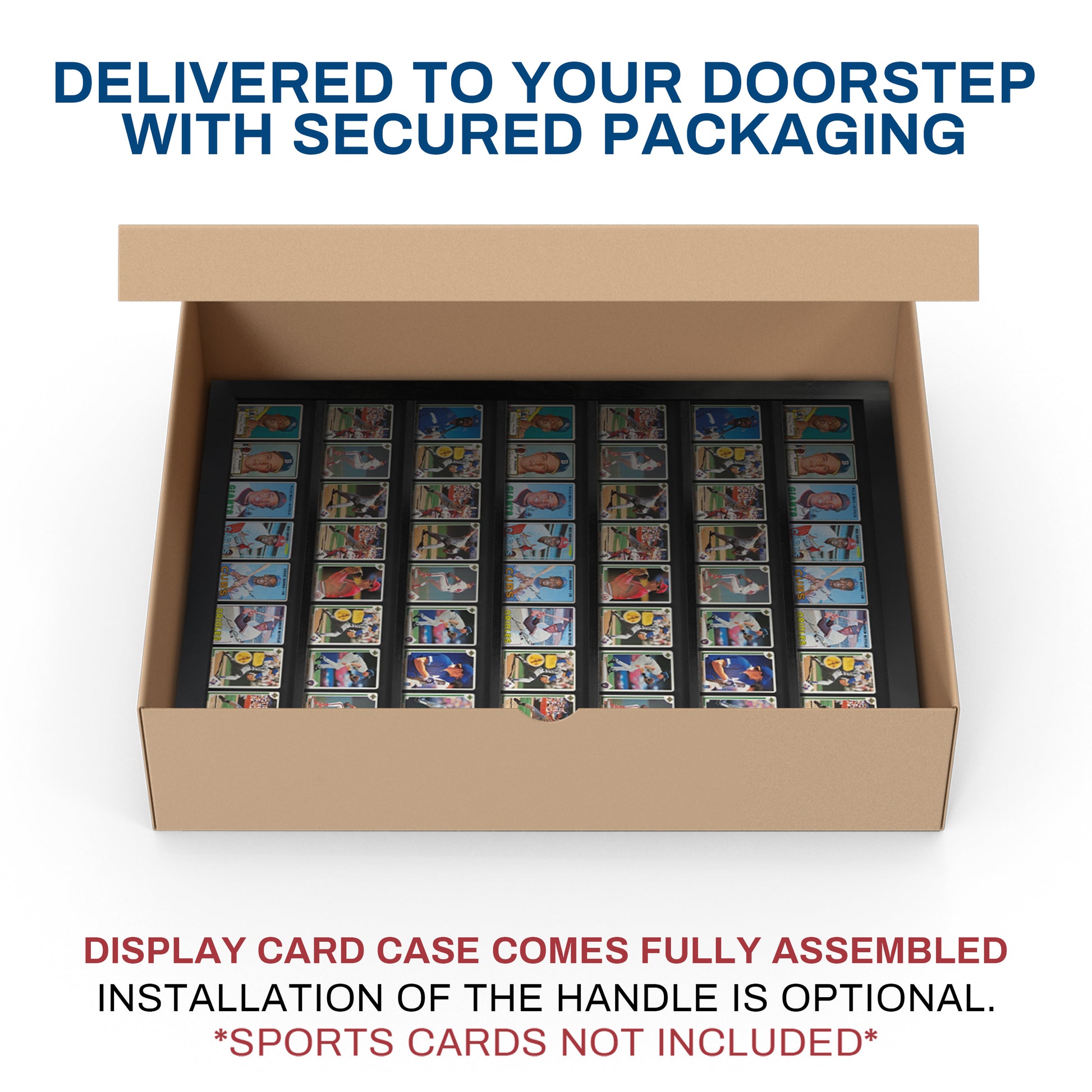 • 【Proudly Made in USA, Premium Card Display Case】- Our sports card display case is handcrafted from solid hardwood w/ a black, cherry, walnut and golden oak finish. It can hold up to 60-74 ungraded sports cards w/ an ideal height of 4.5" & 1.5” thick. It comes w/ brass hinges & 2 brass locks w/ a key. It has outside dimensions of 34.5" w - 39" h - 2" deep, while the inside dimensions measure 33" w - 36.5" h - 1.5" deep. Our ungraded card display case is deep enough to keep your sports & Pokemon cards safe.